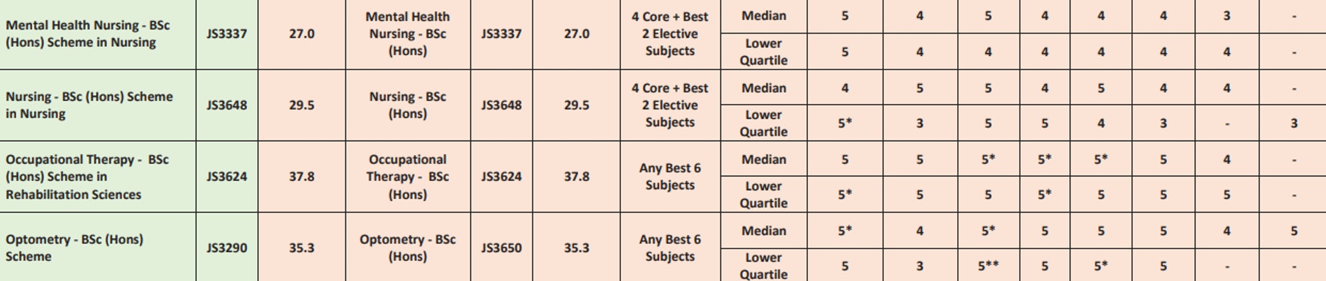 以下的JUPAS醫護學科包括中文大學、香港大學、理工大學及都會大學的護理、藥劑、精神健康護理、職業治療、物理治療、視光、放射治療系,其中門檻最低是都會大學(前名公開大學)的JSSU50 護理學精神科,LQ只是5科16分;考到較高分的話,不妨考慮理大「治療」三寶,出路前途都不錯,根據理大數字,2021年三寶畢業生平均月薪過3萬。