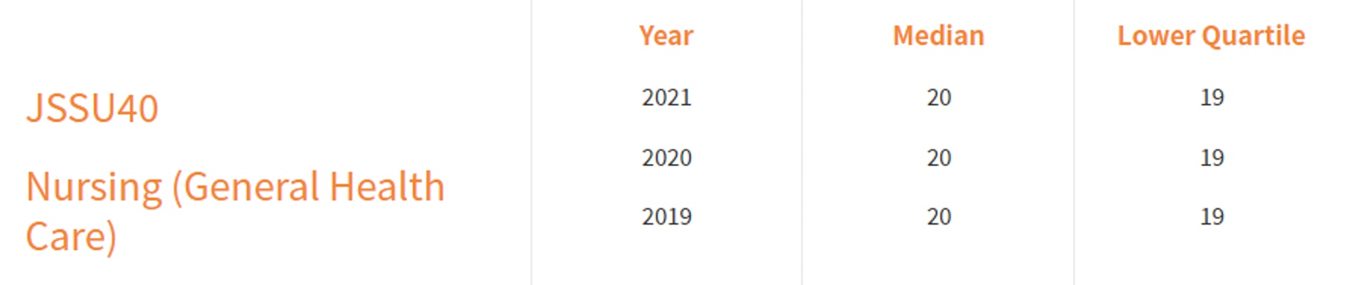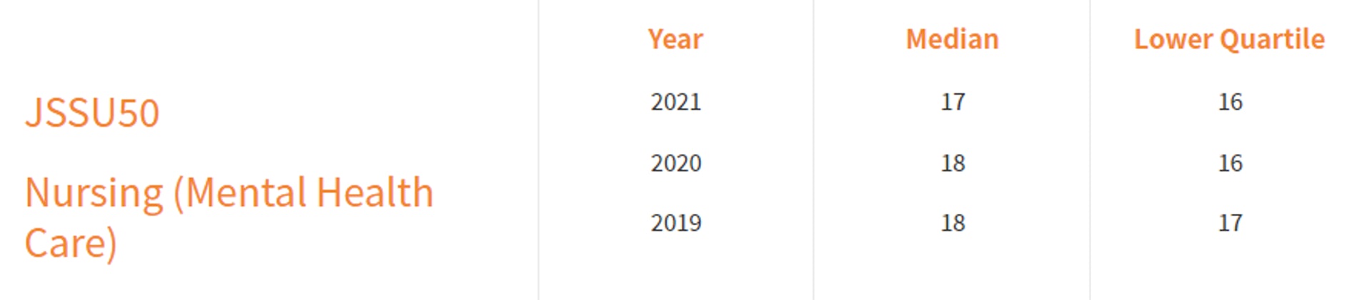 都大舉辦的護理學課程同樣搶手,始終成績要求比其他院校低,精神科(JSSU50 護理學榮譽學士 - 精神科)中位數更只需17分。兩科計分方法雖然只包1科選修,變相主科表現不能掹車邊,不過多達6科選修科可獲1.2倍加乘,中學讀對Elective隨時贏在起跑線。